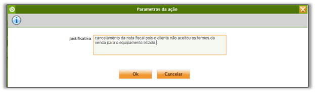 - Após clicar no botão, o sistema abre a tela abaixo com o campo para inserção de uma justificativa para o cancelamento da nota fiscal.