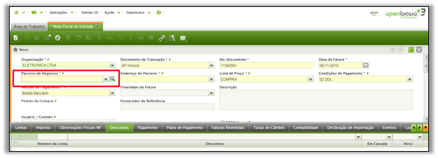 Após a seleção do parceiro de negócio e preenchido o restante dos campos, clicar sobre a aba-linha.