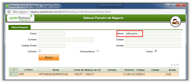 • Após clique, o sistema lista as notas fiscais de compras relacionados ao parceiro de negócio.