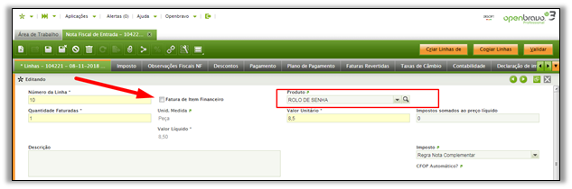 • O parâmetro Fatura de item financeiro deve ser selecionado quando a linha da fatura não é um produto, mas uma conta não configurada como um produto, por exemplo conta de luz ou água.