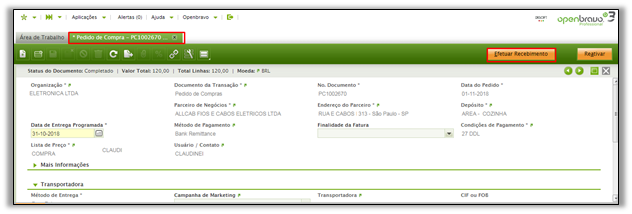 Depois que um pedido de compra é completado, é possível selecionar a forma de pagamento e utilizando o botão "Efetuar recebimento".