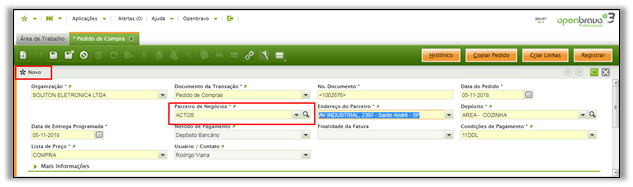 • Selecionar o “Parceiro de Negócio”,  após, campos endereço e condições de pagamentos são preenchidos de acordo com os cadastrados no ‘parceiro de negócio’.