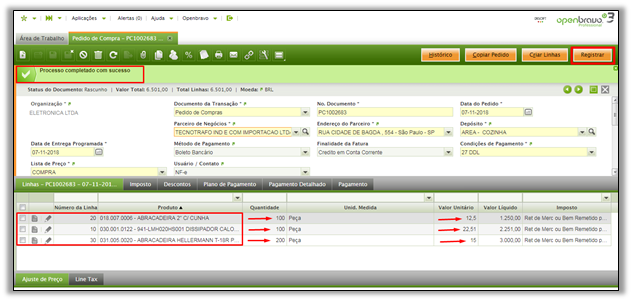 • E gera o número do pedido com as linhas selecionadas, com suas quantidades e valores alterados.