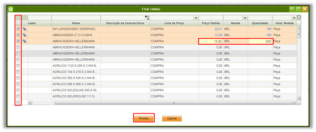 • O sistema abre uma nova tela (abaixo) listando todas as linhas possíveis de serem selecionadas. Ainda sendo possível (manualmente) alterar o valor do item e sua quantidade.
