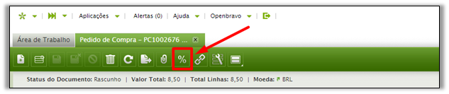 A ação de oferecer Desconto nas operações de compras onde podem ou não incidir valores de frete ocorre no momento da negociação entre o comprador e fornecedor, uma vez definido o valor para desconto; será inserido através do botão  encontrado no cabeçalho. O mesmo poderá ser concedido no valor por linhas ou valor total do pedido;