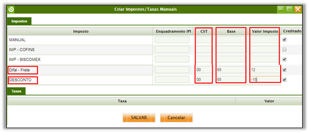 • Base – Valor Total do pedido – para cada uma das despesas de impostos a serem preenchidas, repetir o valor total do pedido.
