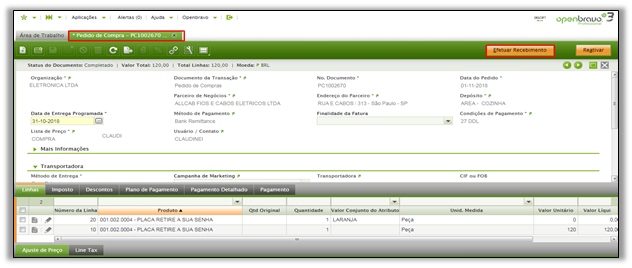 -  O pedido de compra deve estar como rascunho e se caso esteja completado, deverá ser reativado para que seja possível inserir os valores.