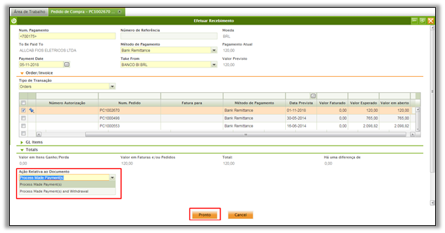 • Process made payment (s) – Somente efetua a baixa do título (não é mais mostrado em relatórios de pendências (por exemplo: pedido de compras com pendências de pagamentos antecipados))