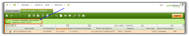 Após as ações o pedido de compra foi completado e passa a estar disponível ao pessoal de compras.