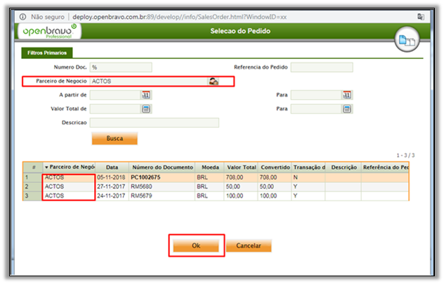 • Por exemplo através do campo “Parceiro de negócio”, selecionamos ACT e clicou no botão .