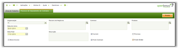 Deixar os filtros em branco iniciará o faturamento, incluindo todos os contratos ativos no sistema.