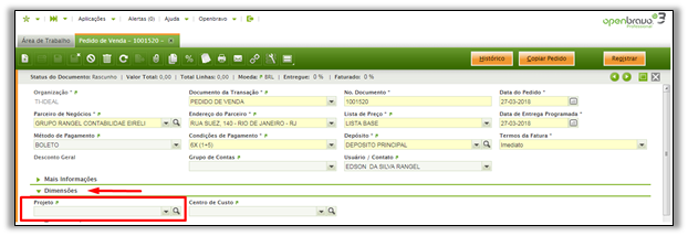 Para vincular ordens de vendas e contratos, a guia – Dimensão, o campo projeto precisa ser exibido no formulário de pedido de venda do cliente. A exibição de dimensões contábeis é configurada no nível do cliente: