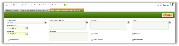 O faturamento do contrato pode ser iniciado na janela do processo de faturamento do contrato.