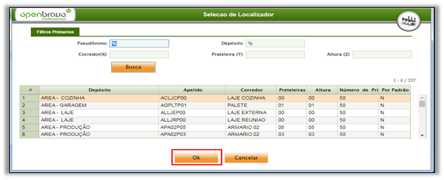 - Após a seleção do estoque e confirmar clicando no botão , o sistema preenche o estoque que receberá o item selecionado naquela (s) linha (s).