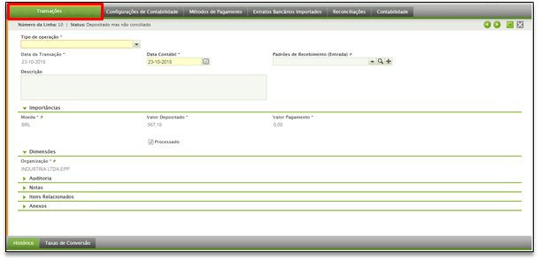 Os campos de descrição e valor na guia de transação serão preenchidos automaticamente e, para concluir a transação, é necessário salvar e processar.