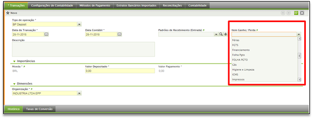 Para criar uma nova transação de item Ganho/Perca, selecione "Depósito BP" ou "Retirada BP" no tipo de transação e selecione Padrões de Recebimento (Entrada). Na combinação de itens financeiros, insira uma data da transação e contábil, insira o valor recebido ou pago e salve e processe a transação.