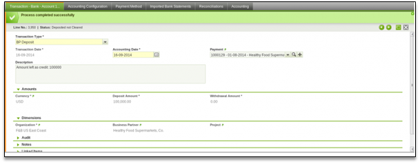 • Posteriormente, após 90 dias (ou seja, condições de pagamento do cliente), decidimos depositar o cheque em outra conta bancária usada para criar e processar o pagamento.