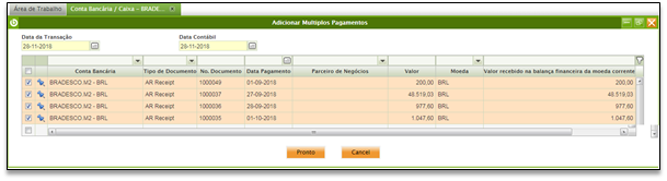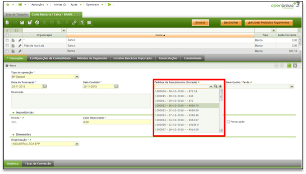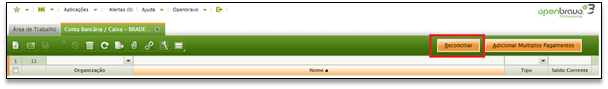 Além disso, quaisquer transações (recebimentos e pagamentos) mostradas no extrato bancário e não refletidas na Conta bancária e também devem ser inseridas no sistema Openbravo para conciliá-las.