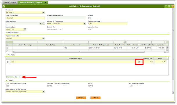 • E, finalmente, para inserir um "Pagamento do item financeiro", se necessário, adicionando "Itens financeiros" em uma grade de GL itens.