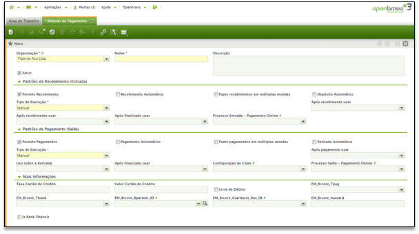 A maneira de criar cada estágio de pagamento no Openbravo é descrita abaixo: