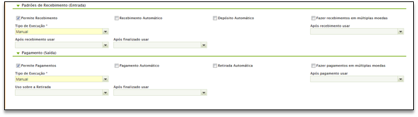 • Manual: este é o tipo de execução por padrão, a menos que seja alterado para "Automático". Esse tipo implica na "Recepção" do pagamento como um evento manual sem a necessidade de nenhuma etapa adicional do sistema. Por exemplo, pagamento em dinheiro.