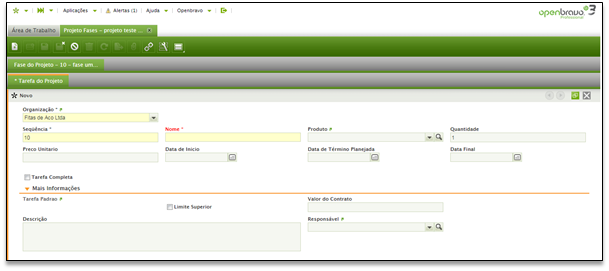 - Projeto fases: formulário usado para registrar um projeto, as despesas planejadas, as margens, para quem o projeto será executado e as fases e tarefas do projeto.