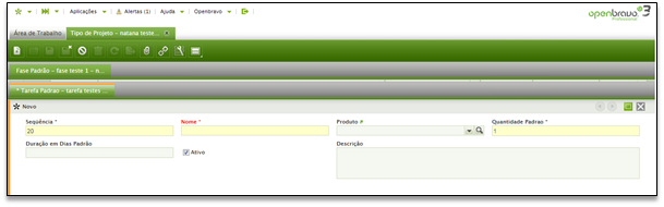 Opcionalmente, as tarefas relacionadas as fases podem ser inseridas também. Os campos nas tarefas são: