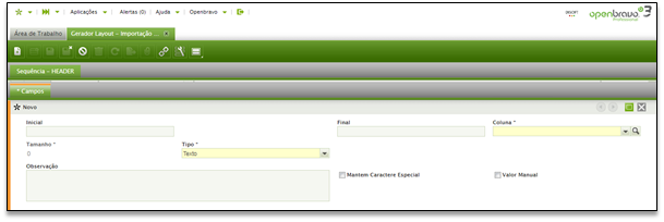 - Tipo: Texto/numérico/financeiro/data – mascará para o campo. Configuração do campo que está sendo registrado de acordo com o layout.