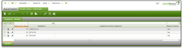 Na sub-aba campos, no passo anterior foi criada a sequência, para arquivos de CNAB cobrança deverão ser criados os três (03) REGISTROS, inicialmente pelo cabeçalho (header) na sequência Detalhes (Detail) e por último rodapé (trailer).