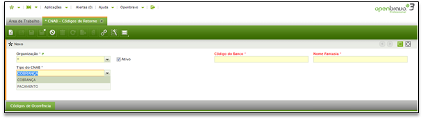 [Menu: Aplicações | Gestão Financeira | CNAB | Configurações | CNAB – Código de Retorno]