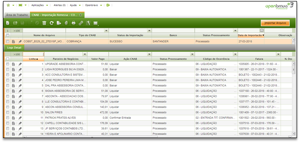[Menu: Gestão financeira | CNAB | Transações | CNAB- Importação Remessa)