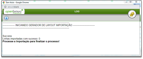 Em seguida, selecionar o layout de importação. E clicar no botão e estando certo o arquivo e processo o sistema emite a mensagem: