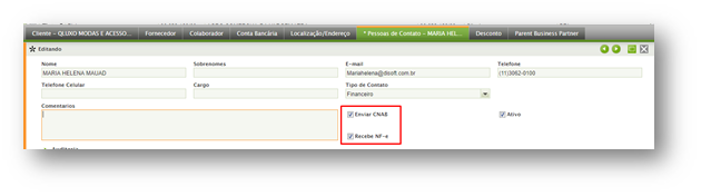 Configure o contato que deverá receber o e-mail com o boleto e nota fiscal, para que ele receba esses documentos, selecione os campos “Enviar CNAB” e “ Receber NF-e”, assim como esta no exemplo do print acima.