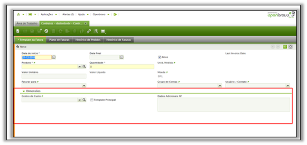 Novos produtos podem ser adicionados a um contrato ativo a qualquer momento. Basta adicionar uma nova linha na ficha Cadastro do plano de faturas, definir data de inícioproduto e quantidade (a data final é opcional). O preço será herdado da lista de preços. O sistema atualizará automaticamente o Plano de Faturas para adicionar novas linhas para este novo produto.