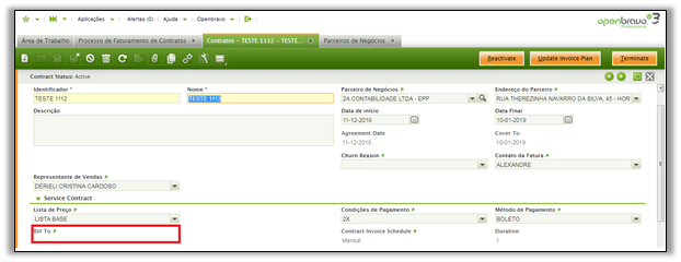 “Faturar para (Bill To)” na tela de contratos