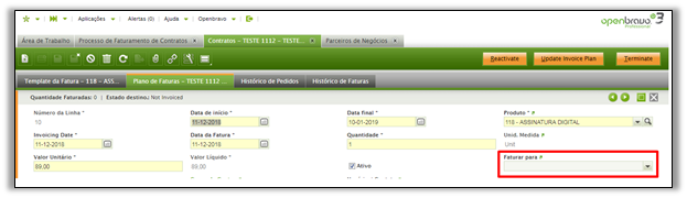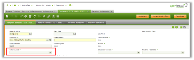 O campo Parceiro Faturamento está disponível no cabeçalho do contrato e também nas linhas Plano Master de Fatura ou Plano de Fatura. Ao adicionar um parceiro de negócio no campo “Faturar para (Bill To.)” no cabeçalho, este parceiro de negócio será cobrado pelo conteúdo total do contrato, enquanto se for adicionado em linhas, apenas o produto na linha será cobrado a esse parceiro de negócio.