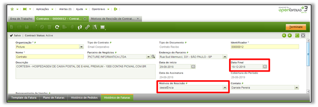 O processo de rescisão do contrato muda o status do contrato para "Expirado", o que significa que os serviços / produtos associados ao contrato não são mais fornecidos.