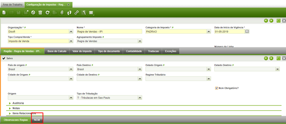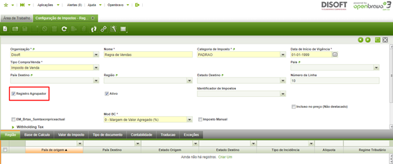 Organização: nome da empresa para qual você quer gerar a regra de imposto, caso seja para todas as empresas do grupo selecione a opção (*).