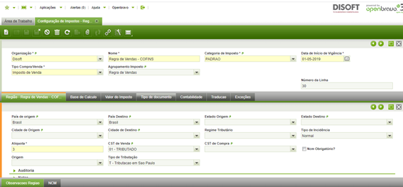 Categoria de impostos: o sistema irá trazer uma opção default, pré configurada.