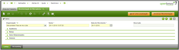 Este campo é padronizado para a data atual, mas sempre pode ser alterado conforme necessário. - Data de movimento: é a data da transação de movimentação de mercadorias.