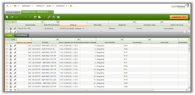 A aba-linhas representa a lista de contagem de estoque de um determinado estoque.