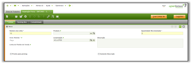 - Bandeja de armazenamento: de onde o produto é levado para envio. Preenchido automaticamente com base no campo Produto, que inclui o depósito como parte de seu seletor.