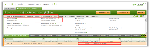 É possível anular totalmente uma fatura de venda, usando o botão de cabeçalho "Reativar" e depois a ação "anular ", desde que a nota fiscal se encontre no status ‘completado’ esta ação implica: